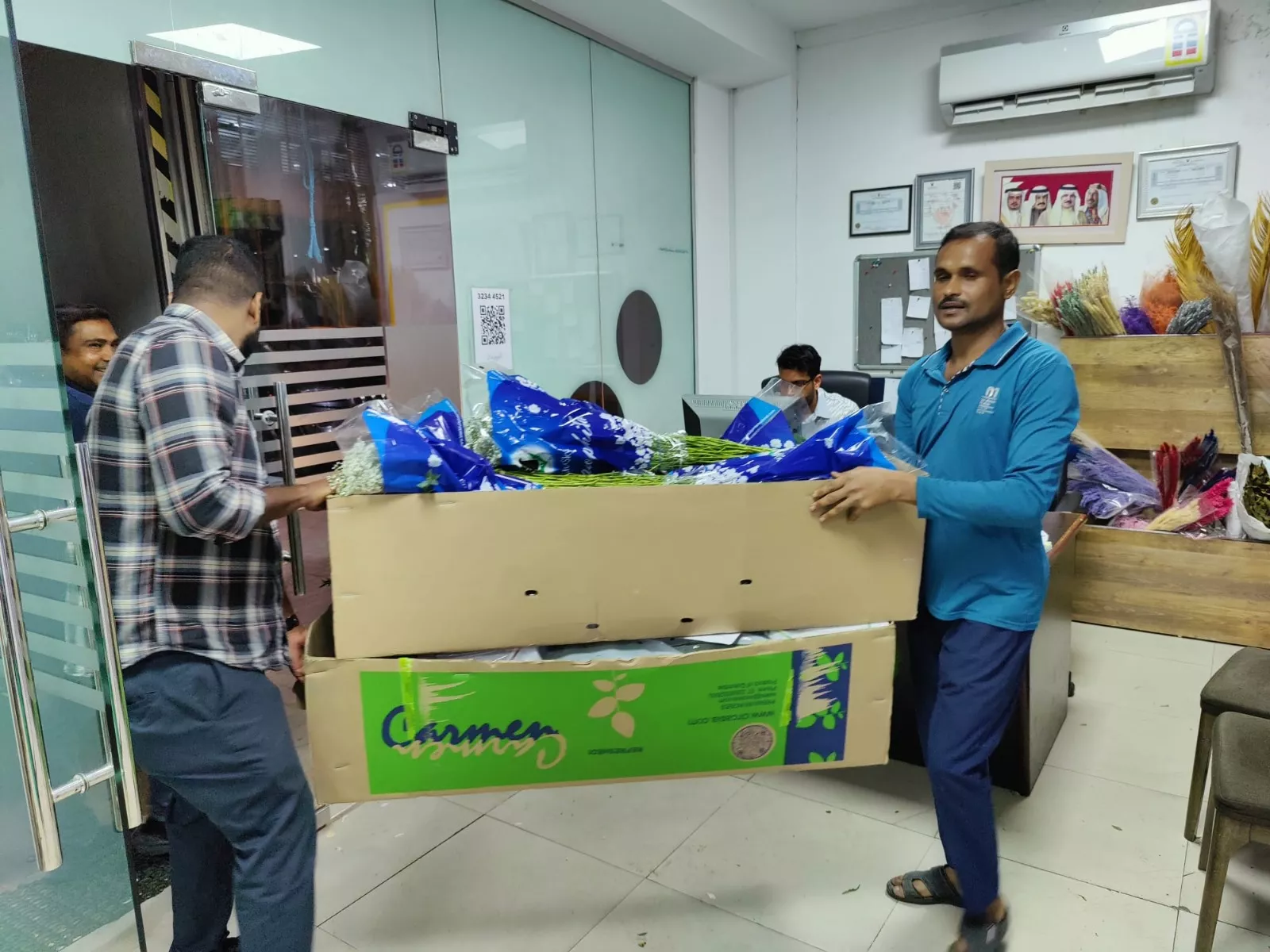 If it is not possible to process floral shipments immediately upon receipt, boxes and wrapped flowers are kept at a cool temperature in one of the cold stores.