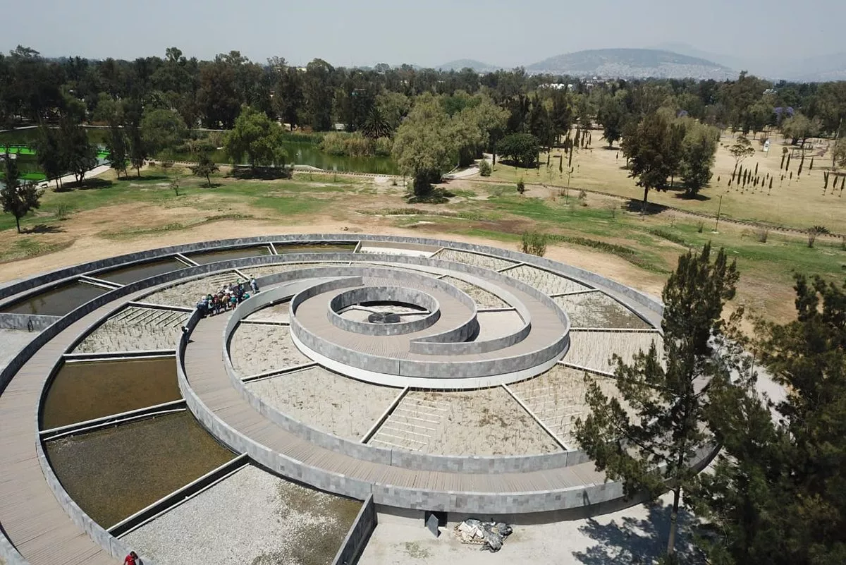 - Creation of artificial wetlands, with benefits such as CO2 capture greater than forest surfaces, oxygen, temperature regulation, preservation of habitats for aquatic fauna, resident and migratory birds. The one designed in the form of a snail stands out within the San Juan de Aragón urban forest, of 3,100 m2 with a filtration capacity of 140,000 m3 in 24 hours.