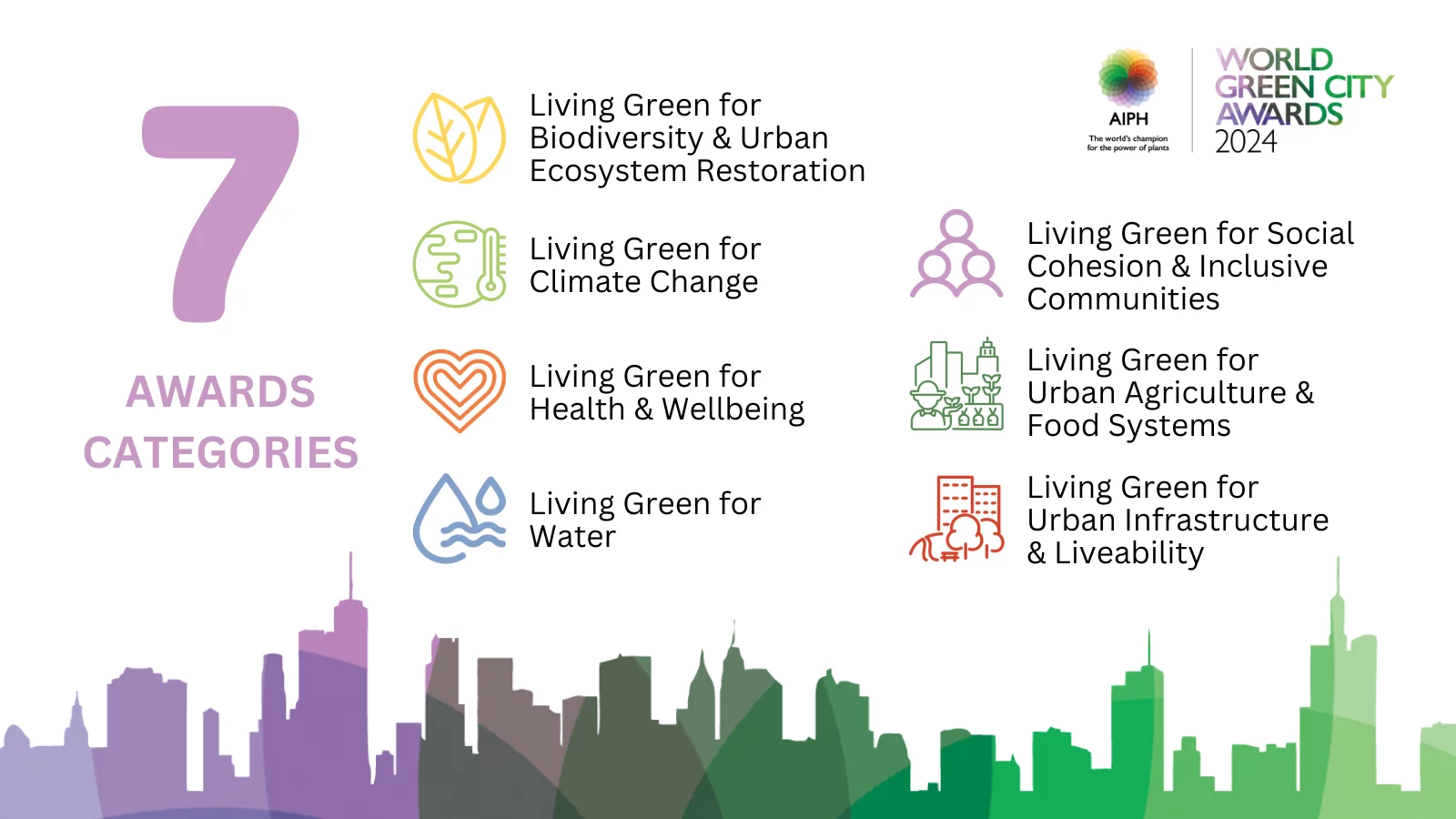 The 2024 edition of the AIPH World Green City Awards is offered in seven categories, with three finalists in each category from which one category winner is selected, and with one Grand Winner chosen from the seven category winners. Entries are compiled and submitted by cities through an online portal which is open for six months until the submission deadline on 15th September 2023.